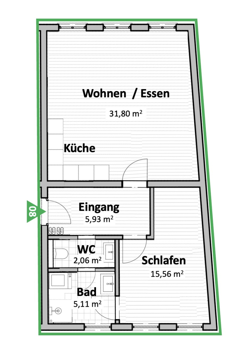 Die großzügige 2-Zimmer Wohnung im Dachgeschoss (Ost) mit ca. 60,46 qm überzeugt durch eine günstige Raumaufteilung. Die Wohnung verfügt über eine moderne Einbauküche und Gauben für einen schönen Ausblick. Der offene Wohn-/Essbereich bildet das Herzstück der Wohnung. Das Bad ist funktional geschnitten und bietet zusätzlich Platz für eine Waschmaschine (Anschlüsse sind vorhanden).